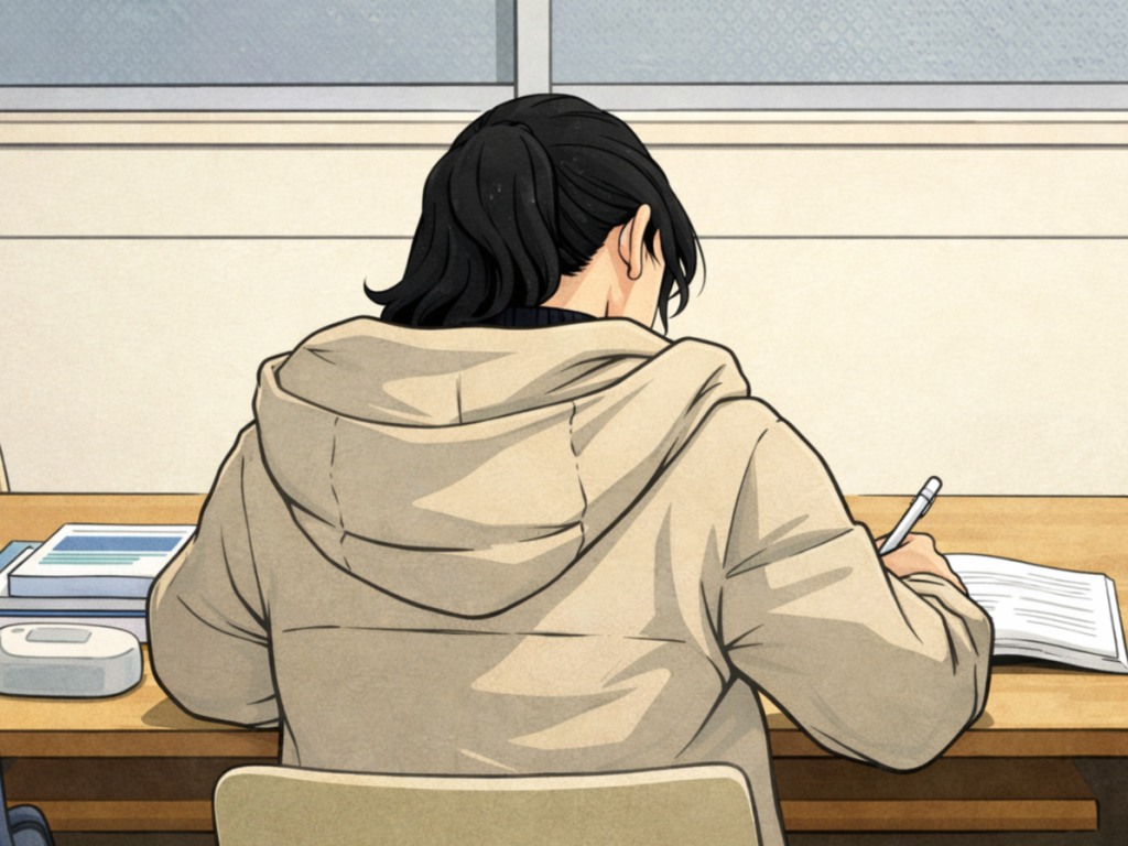 机に向かって集中して勉強する。